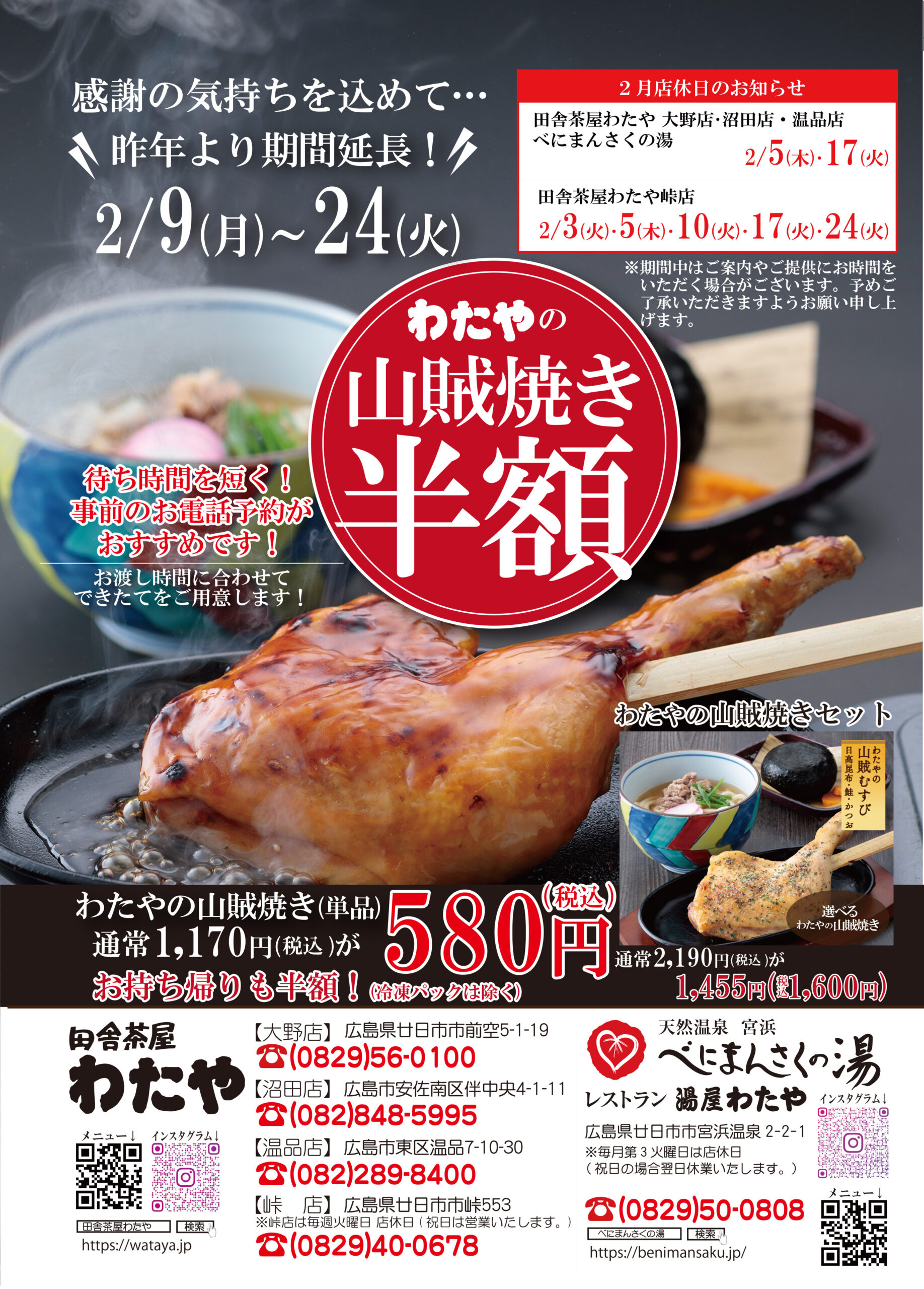 あのイベントまたやります!|2/9(月)~2/24(火) わたやの山賊焼き半額!